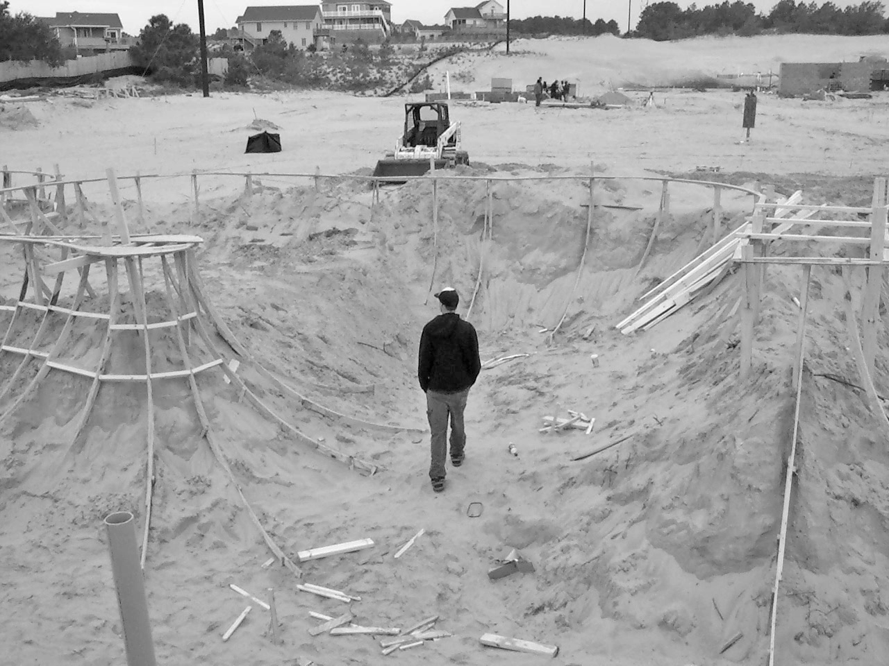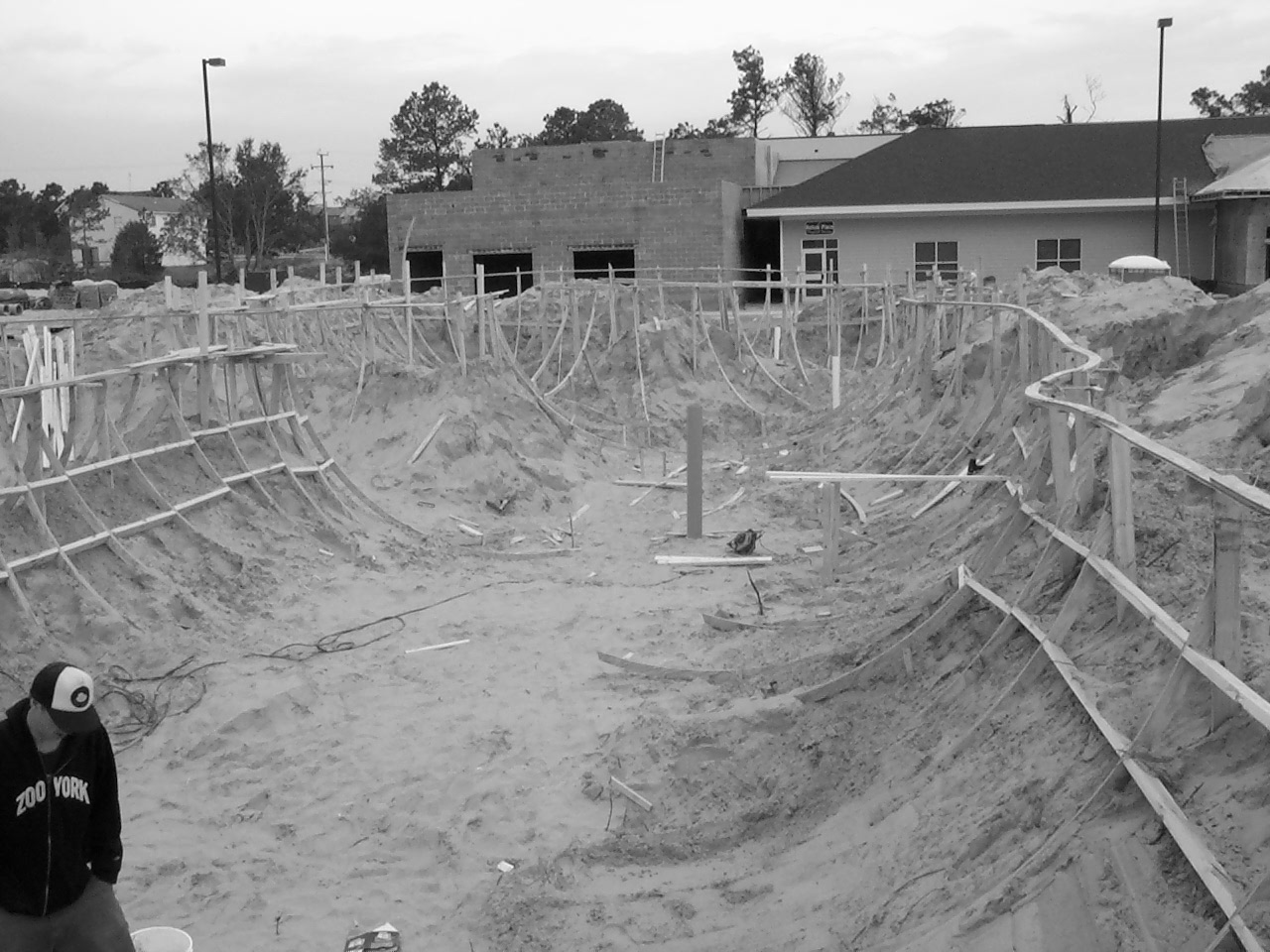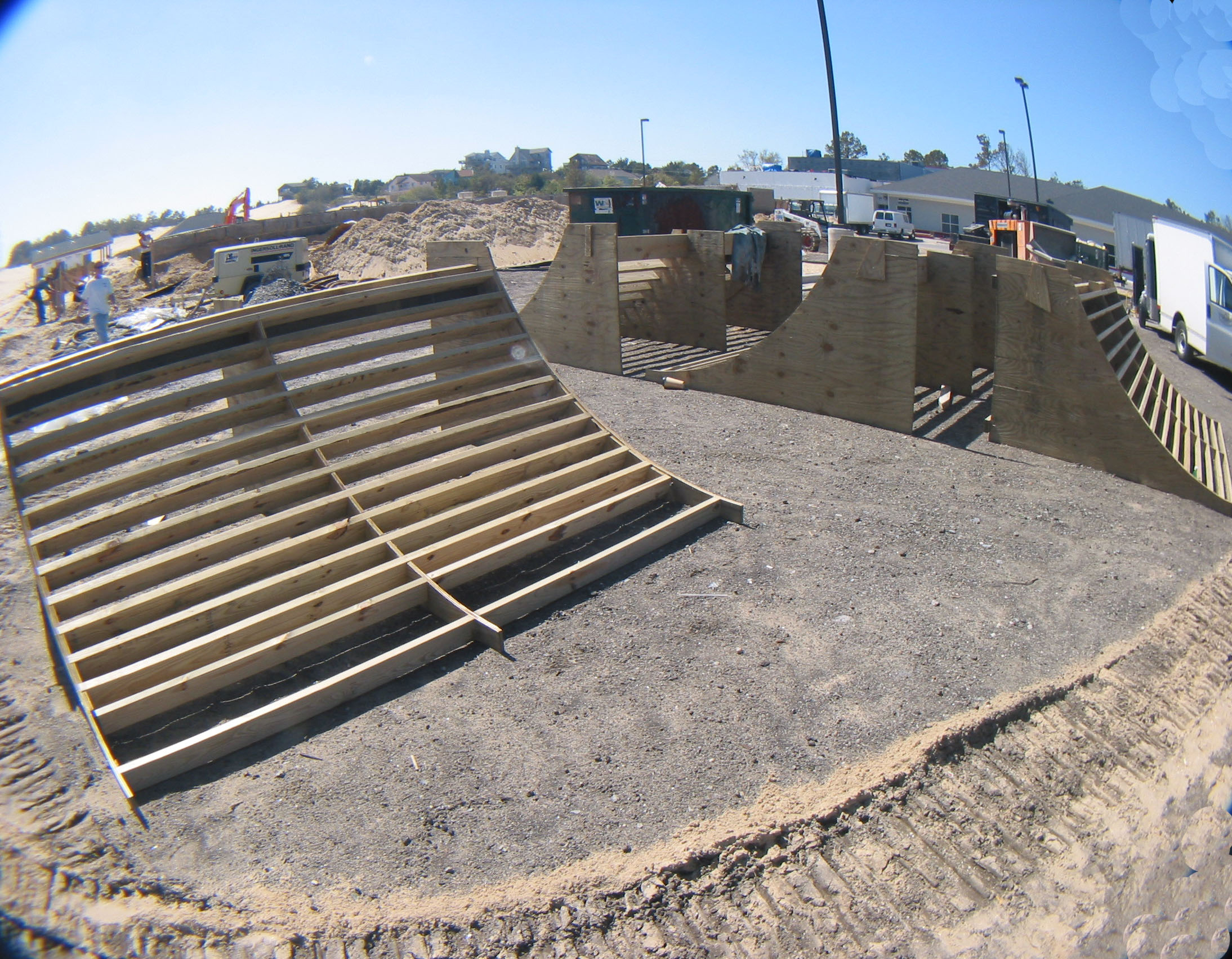 There is a new skate park coming to the Outer Banks. The Town of Nags Head and the YMCA each put up a hundred grand. The Y is adding on to their already new Nags Head Facility. The membership interest far exceeded their expectations so they decided to upgrade the facilities. There will be a new additions on to the gyms, a new outdoor pool, and a waterslide with a giant fifteen foot deep pool. (nope, forget it, one foot trannies to vert.) Along with all this madness will be a skate park. It will be roughly 15,000 feet. The Y contacted some of the local skate crew and we helped them formulate a plan to get the most park for their money. After we talked shop for a while we decided that the park should be a hybrid of wooden/skatelite street elements and a concrete bowl area with lots of flow. Charley and Sam Buxton desiged the street course, with the help of Jesse Davis working the 3D computer drawings, to represent the latest in street course design. They decided to hire Marc Corbett (of Wanchese fame) and crew to build the street. Marc’s bid for the wooden/skatelite course was within budget and next we set out to hire the concrete crew. We contacted some of the country’s top park builders. Grindline of Washington state, Team Pain of Fl., Wally Holiday of CA, Woodstock of NY, and American Skateparks (Omer) of MD. In the end it was Grindline that came in within our budget and next came the design meetings. This would be Grindline’s first East Coast park.