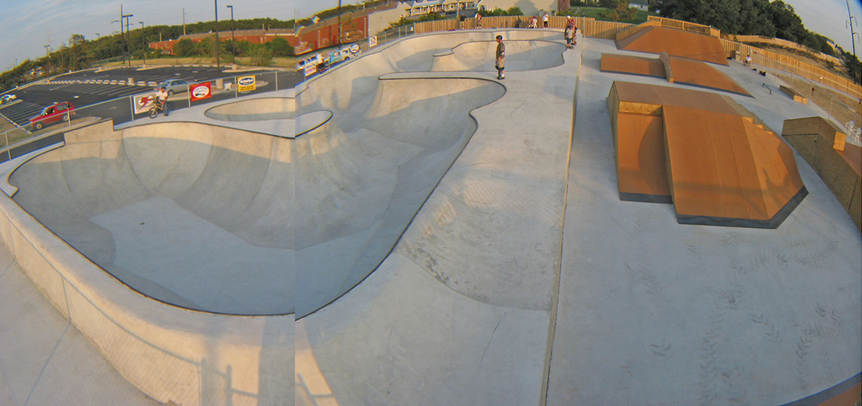 05/1/2020: Whats written below was what was originally put on the Nags Head Y page on ECA, Some things that were not brought up besides updated pictures lol, was this was not an easy bowl to skateboard in, especially for beginners! Sure, plenty of people figured out the lines right away, Some kids are who they as a result of riding this park. But as you’ll see below in the original design, we were hoping for two separate bowls that would break up the session a little bit. That said, when the bowl was finished, it was heavily session-ed from folks all over! After a period of years, the surface of the bowl really went south. Abrasive, thin in areas, coping was always rusty the salt air environment really took its toll on this park. The street course became out dated, worn down, park management changed hands so much, nothing was really done about any of it. The Ymca eventually turned the park over to the town. The town has done zero capital improvements in 10 years!